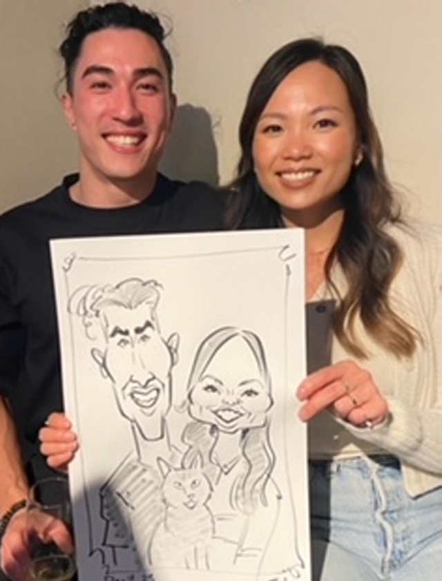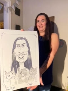 ● For Traditional Caricatures: I started with the traditional process of drawing, and continue using it. I have lights to illuminate my subjects and my art, an easel, a chair for myself, my pens, pencils, high quality 11x14 paper, and cardboard backings with cellophane bags to preserve the drawing so it doesn't damage.