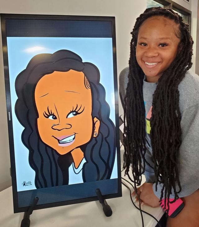 She was great! This was such a hit at our wedding that we had to extend the time in order for everyone to get a drawing. The entire time Marietta was extremely nice and accommodating to everyone’s wishes. Pretty sure she didn’t stop drawing the entire time we had her and didn’t complain once. We are so pleased with this whole experience. 5/27/2022 – Wedding